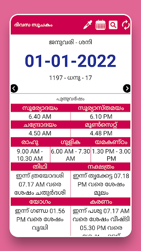 Malayalam panchangam 2022 allows you to view Malayalam year, Malayalam month, Kalam, Sooryodayam, Sooryaasthamam for all days in year 2022 in offline mode.