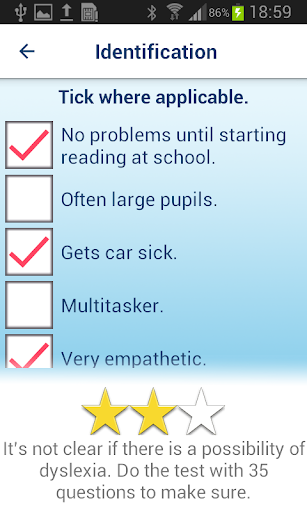 The purpose of the app is to quickly get an idea if someone is showing any signs of dyslexia. The earlier dyslexia is recognised, the sooner a treatment plan can be implemented. But be aware, this is an indication and not a diagnosis.