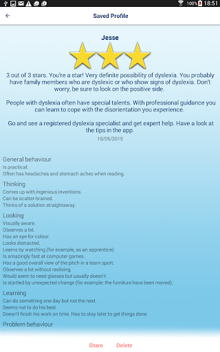 Dyslexia Test & Tips is the first app in the world that helps you quickly identify dyslexia and create a profile of the person being tested.