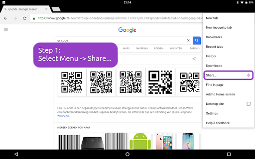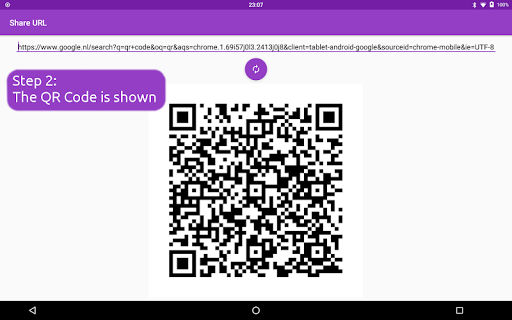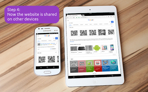 Ever visited a website on your tablet and wanted to open it on your smart-phone? Or did you want to share a website with a friend without reading head to head on one device? With this app you can easily share your URL's or pieces of text from text- or Whatsapp-messages between different devices. No need for Bluetooth or other difficult and error-prone protocols. Just a simple QR Code is shared between devices.
