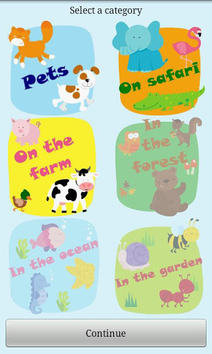 With happy pictures of animals in the themes Pets, On safari, and On the farm.