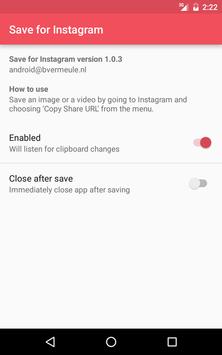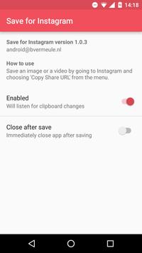 Save for Instagram waits in the background until you choose "Copy Share URL" from within the Instagram app. Save for Instagram will then pop up asking you whether you want to save or share the photo or video.