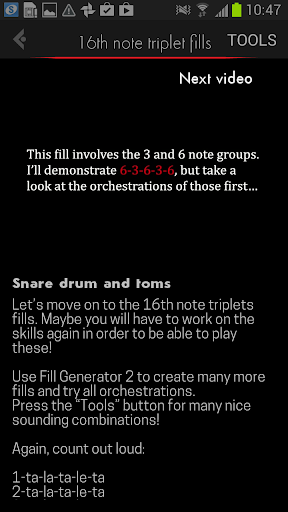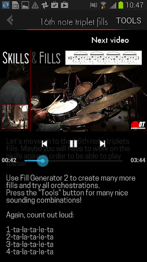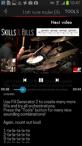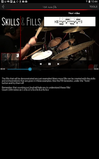 The Skills & Fills video drum app deals with the same system that is used in the drum book (see: www.skillsandfills.com). Over 60 linear drum fills (others than in the book) are explained from scratch and demonstrated in different tempos! The drum app is characterized by “less talking, more drumming”.