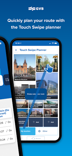 - Unique Touch Swipe planner – The most personalised trip planner in the Netherlands. Simply swipe from your current, favourite or any other set location to the key places of interest in the city and your trip will be planned instantly. Then you can personalise your destinations. Select your destinations from a list of main locations in Amsterdam and surroundings, and save them for later use.