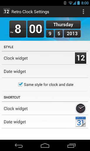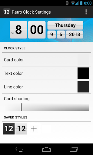This Retro Clock Settings companion app allows you to customize the look and feel (like the colors, transparency, or shortcut applications) of Retro Clock Widget.