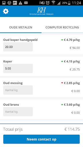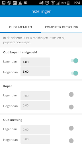 Heeft u een mooie partij schroot liggen en u heeft een ideale prijs in uw hoofd? Schakel dan de optie in dat u een push bericht ontvangt zodra uw oud metaal soort een bepaald niveau bereikt.