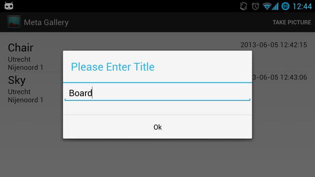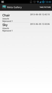 School project. The Meta Gallery allows you to take pictures and stores them with a timestamp and location. You can view all the pictures in a list.