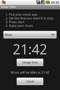 Never leave your music all night on when you fall asleep with Music Killer This app lets you set a time and automatically closes your music app Update 1.1.1 - Choose custom music app - Fatal bug fix Music Killer does not work on all phone!