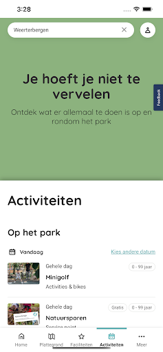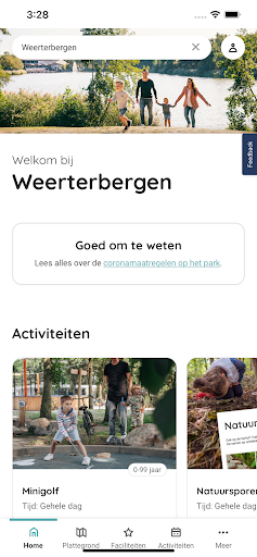To make it easy for you, in this app you will find all the information that will be useful during your stay in 1 place. No back-and-forth to reception, just nice and relaxed. For example, in the current activity program you can see what there is to do at the park today, tomorrow or any other day. And when the end of your stay is looming, you will also find all the departure information in the app. Thus, you'll know exactly what to do upon departure.