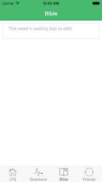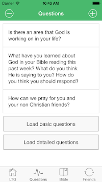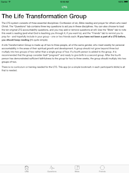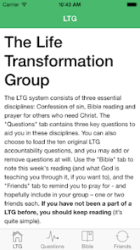 The LTG app lets you store your personal accountability questions, your weekly Bible reading and a list of friends you're praying for. It also gives you a basic introduction to the system and how to implement it.