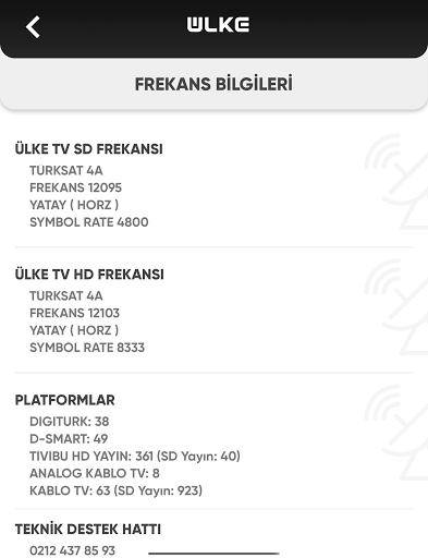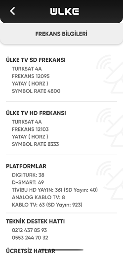 Farklı platformlardan Ülke TV’yi izlemek istediğinizde Teknik Erişim sayfamızda, uydu frekanslarımız, diğer platformlardaki yerlerimizi görebilirsiniz. Ayrıca teknik destek almak isterseniz destek hatlarımızı da aynı sayfada bulabilirsiniz.