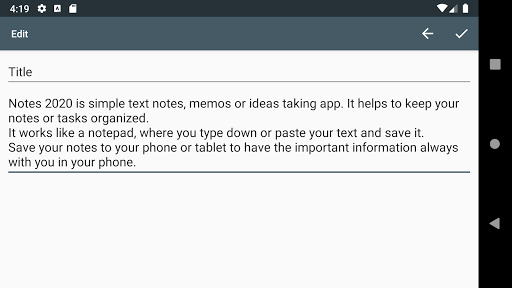 Notes 2020 is simple text notes, memos or ideas taking app. It helps to keep your notes or tasks organized.