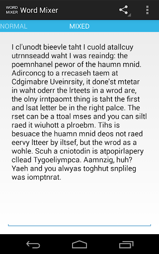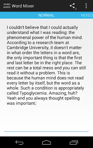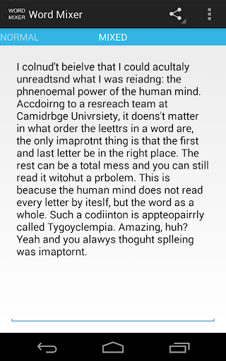Cognitive processes are quite fascinating. Explore the human brain's ability to effectively understand words with mixed letters. This amazing ability to read words with their first and last letters in the correct place is known as typoglycemia. Though not everyone can read typoglycemic text you can play around with the Settings to change the ease of reading. You can also send text from other apps to convert via the share menu. Write mixed words and share with friends!