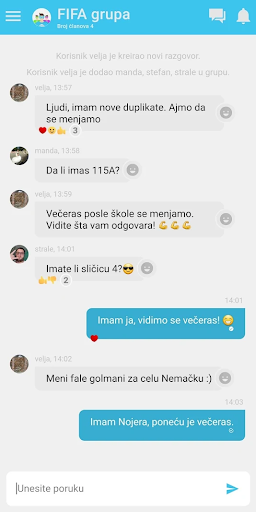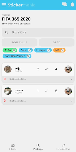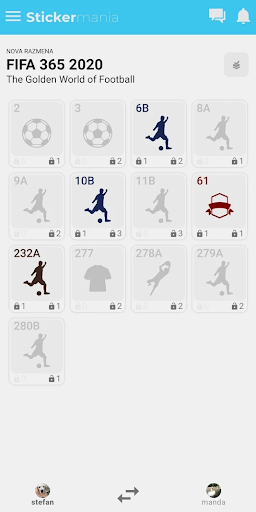 - Search - Search users by different criteria. You can search users by city, missing stickers, album chapter, etc... From the shown users, chose one that you deem as the best fit and tap to see exactly which stickers the users have for you. Chose the stickers you like best and the stickers you offer in return and create the exchange request!
