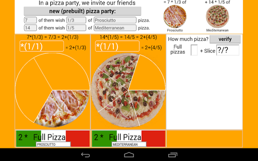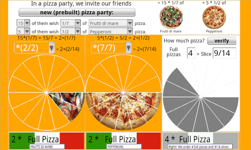 "How much pizza...?" About adding fractions: Working with Improper fractions and Mixed fractions. The program build the problem, and you can solve filling the textboxes containing question marks. There's a tool that helps you find the common denominator.