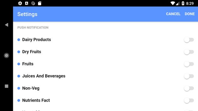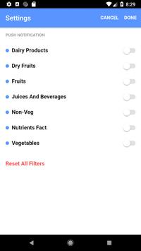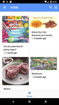 This app includes vegetables, fruits, dry fruits, non-veg, dairy products and juices & beverages information sections.