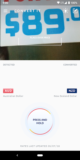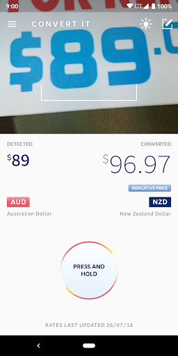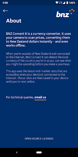 BNZ Convert It is a currency converter. It uses your camera to scan prices, converting them to New Zealand dollars instantly – and even works offline. The app uses the latest mid-market rates that are accessible when your device is connected to the Internet. Those rates are then saved to your device until you’re next online. Those rates are not able to be transacted on by consumers. See our FAQs for more information