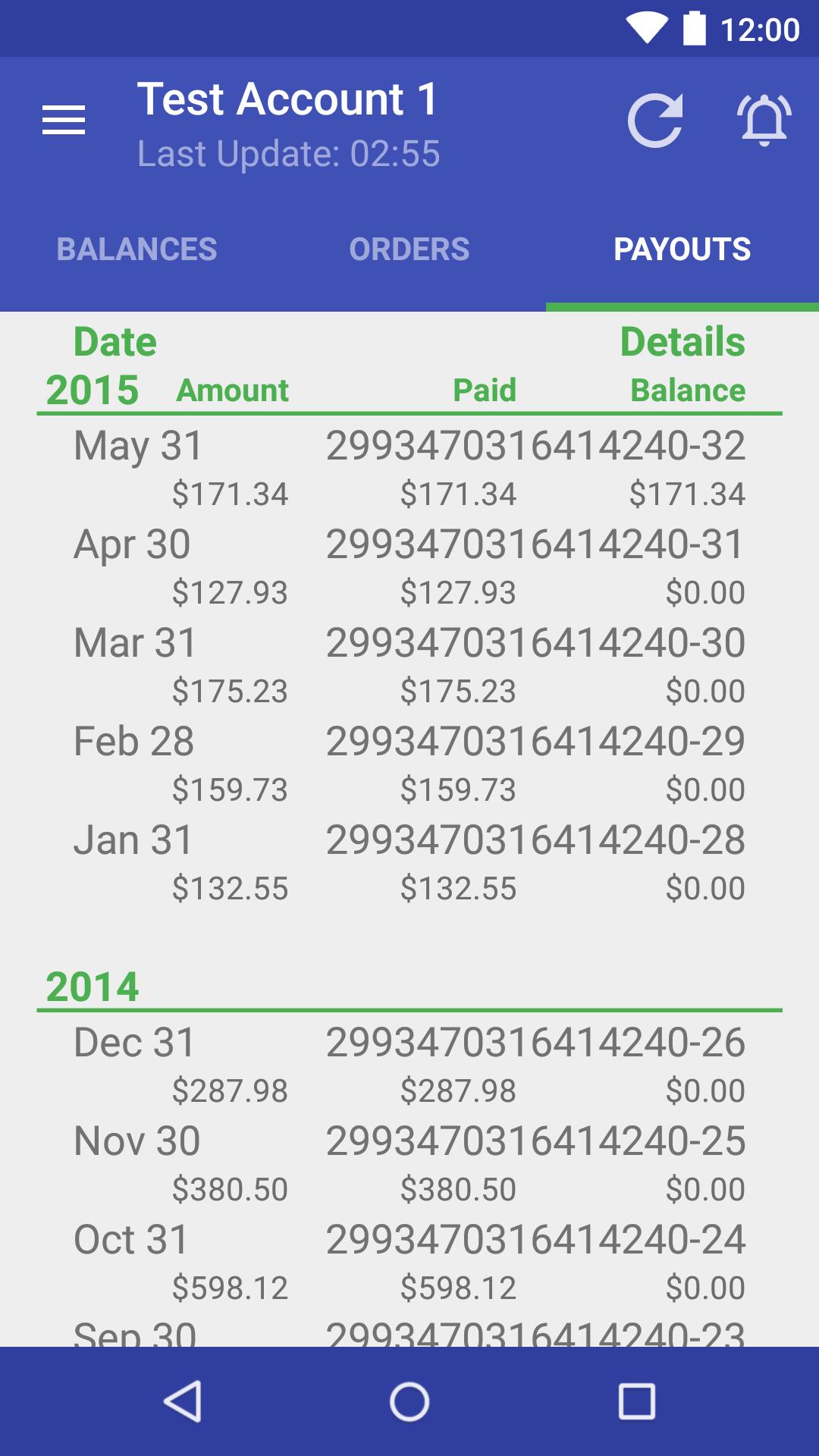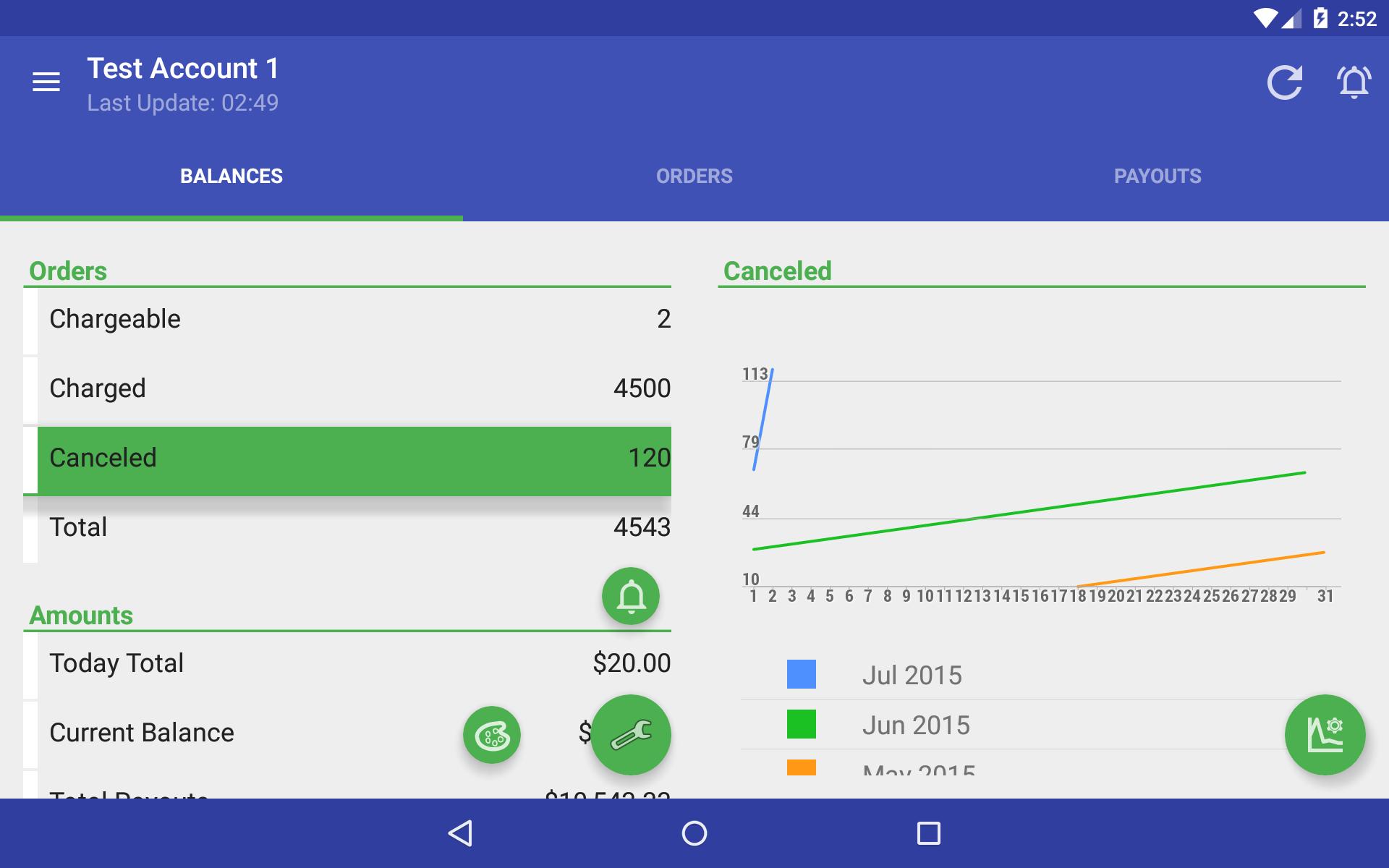 * Amounts - Today Total, Total Yesterday, Total this Month, Current Balance, Last Payment, Total Payouts