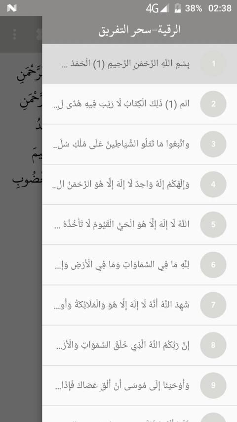 • بمجرد فتح قائمة التصفح في تطبيق رقية لسحر التفريق يظهر لك الباب المفتوح حاليا بخلفية داكنة وبدية صغير من الآيات الموجود في الرقية الشرعية لعلاج سحر التفريق، كما يمكن قراءة هذه الآيات على أي شخص مصاب ب أعراض السحر والعين أو أعراض المس أو حتى أعراض المس العاشق.
