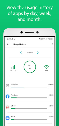 You can track the usage of the device and all the apps. Choose duration (day, week, month) while getting the summary of the data usage. The summary screen displays total, mobile usage, and wifi usage.