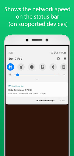 It monitors the data usage of all the installed apps and the device. On the notification bar, it displays the current network name and current day's data usage. If you have a data limit, it shows the remaining data, plan, and renewal date.