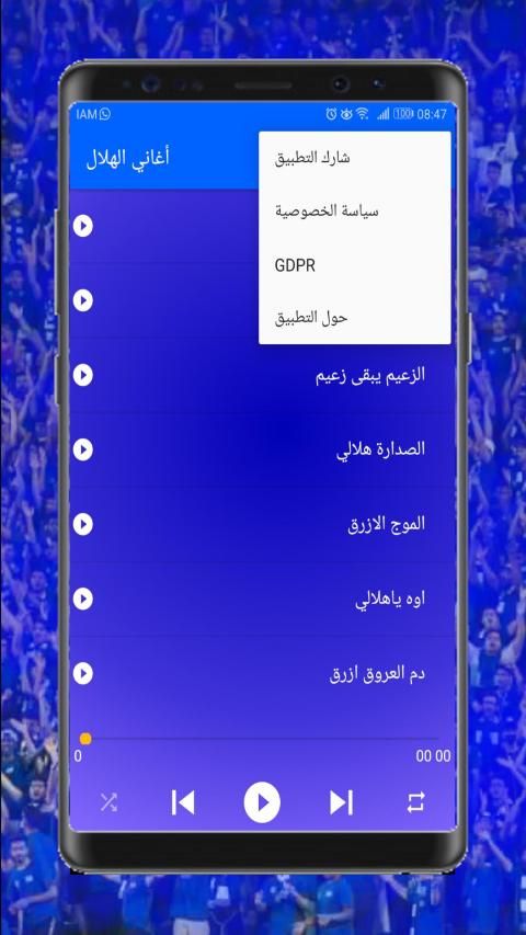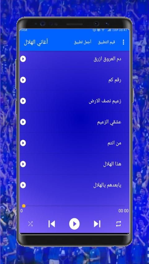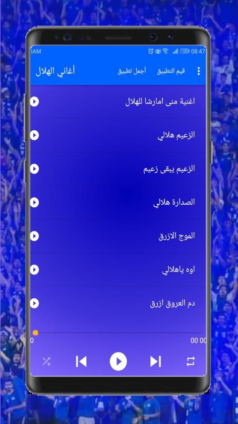 قمت بتطوير هذا التطلبق خصوصا لجماهير نادي الهلال السعودي بحيث قمت بجمع قائمة من اجمل اغاني الهلال او اجمل الاغاني الهلالية وهي كالتالي