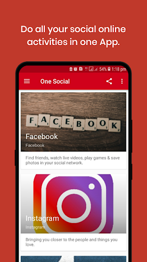 One Social app is an app which will help you do all your social online activities such as social media apps,online shopping apps,search apps and more things. You will be able to do all online activities and more in just a single app. Download now and save your space storage on the phone. All social media apps such us youtube,facebook and instagram all on one app.