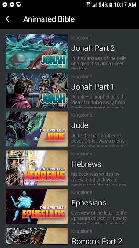The Animated Bible is an app designed to explain the Bible in short animated segments and to help viewers remember and understand the Bible. Based on the Kingstone Bible, the most complete graphic adaptation of the Bible ever done, the Animated Bible uses professional voice artists, top comic book artists and powerful soundtracks to illustrate and explain each section of the Bible. To also help the next generation grow in their faith, the Animated Bible app also features the popular 101 Questions about the Bible series. To find additional quality products you can download the Kingstone Comics app or visit www.kingstone.co for the very best in Christian comic books and graphic novels.