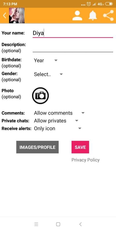 Well, when you first open the app, you can either log in with your Girls Live Video Talk account or complete a profile form to let others know a little bit more about you. The items in the profile are: Name, nickname, optional description about yourself, birthday, gender, and photo. You can also specify whether receiving comments or private messages are allowed or not.
