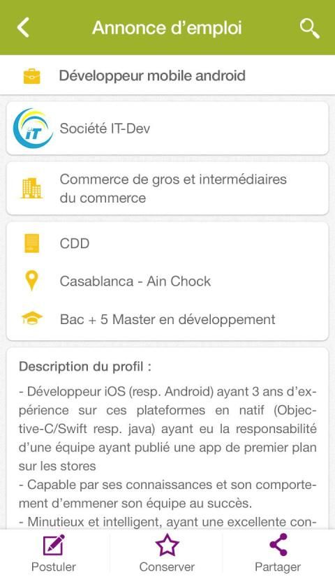 • Vous pourrez postuler aux offres d’emploi qui vous intéressent via l’application avec votre CV personnel ou le CV de l’Anapec engendré suite à votre inscription ;