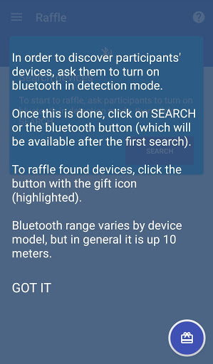 Bluetooth Raffle came to increase the fun on your lectures. Everyone likes gifts, and when you raffle some of it on your talks you need dealing with boring software or worse yet, names on small pieces of paper.