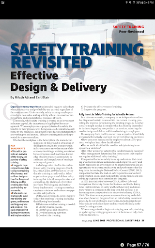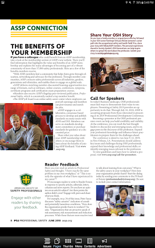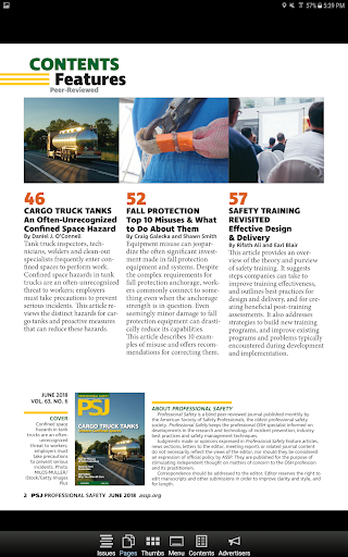 ASSP's Professional Safety journal shares the latest technical knowledge in OSH. Each issue delivers practical guidance, techniques and solutions to help OSH professionals identify hazards, protect people, prevent injuries, improve work environments and educate management that investing in safety is a sound business strategy. The journal is ASSP's most highly rated member benefit and is widely referenced in safety literature and research.