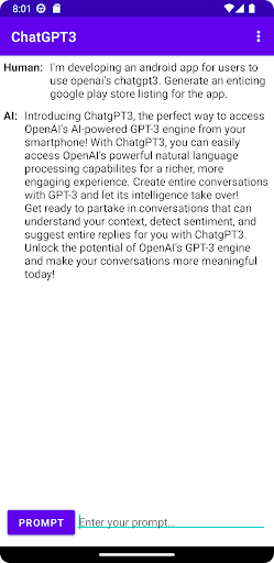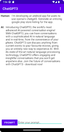 Human: I'm developing an android app for users to use OpenAI's chatGPT3. Please generate an enticing Google Play store listing for the app.