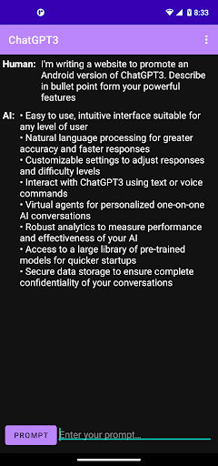 Human: I'm writing a website to promote an Android version of ChatGPT3. Describe in bullet point form your powerful features.
