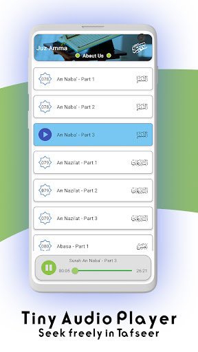 By Opening AlQuran Tafseer Pashto (تفسیرالقرآن پښتو) application, tap on Get stated button. Then you will see all the Surahs (Verses) of Quran. Tap on any of them the player will be shown and started. AlQuran Tafseer Pashto can be played in background and can be handled from notification panel.