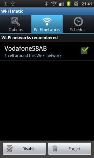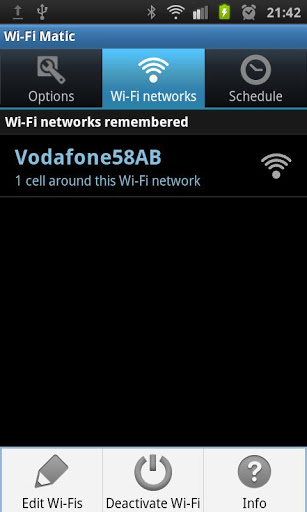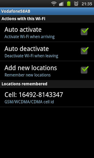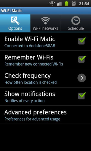 Important: do not download this app if you are looking for WiFi password revealing or WiFi configuration assistant.WiFi Matic activates and deactivates WiFi of your device automatically depending on your location, helping you to save battery and consumption of data through your operator network.It detects automatically the location of known WiFi networks f.i: home, office, etc., turns on WFi when you arrive a place where there is WiFi, and turns it off when you leave.You will simply notice that your device automatically uses WiFi in the usual places where you have wifi access while it keeps WiFi off where you don39;t have it. How does it work?It DOES NOT USE GPS neither requires to have Android network location services enabled, as it uses your operator network cell identifiers cell tower identifiers as the relative location where you are, and where your WiFi networks are. It is designed to minimize usage of resources and battery. WiFi Matic detects and learns automatically locations where you are connected to a WiFi, and doesn39;t need configuration. Besides, it allows you to manage manually your WiFi when needed not interfering with you or with your device data connections. How is it used?1. Once it is installed, click on quot;Enable WiFi Maticquot; and leave the app in the background. 2. Whenever you want to connect to a WiFi for the first time, do it manually in the Android Wireless networks settings menu, or just let Android connect to any of the networks already known by your device.3. And that39;s it: WiFi Matic will learn your WiFi location when you get connected. Whenever you leave that place, WiFi will be automatically turned off and whenever you get back, WiFi will be automatically turned on.See: https:sites.google.comsitewifimaticappkeywords: wifi wifi wireless automatic turn on off location positioning detection scheduler
