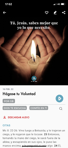The application allows you to listen to 10-minute audios prepared by priests to help you pray, commenting on the Gospel and fostering a personal encounter with God.