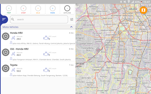 In Vinaa car tracking & fleet management mobile application you can track real time all vehicles on map or from list, or select individual vehicles when you need to track movements & more specification of a vehicle. It present the status of the trip(in trip, idle, stop, park and offline) along with the start time of the status, duration and distance It’s also possible to customize tracking parameters and sensors to display for selected vehicle