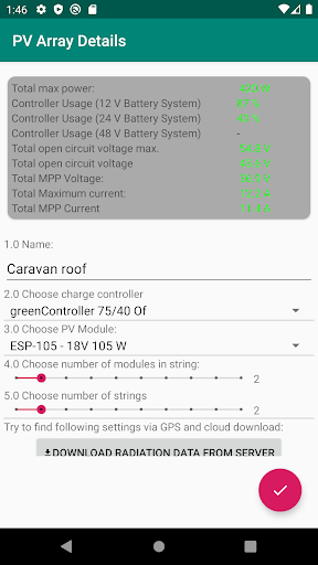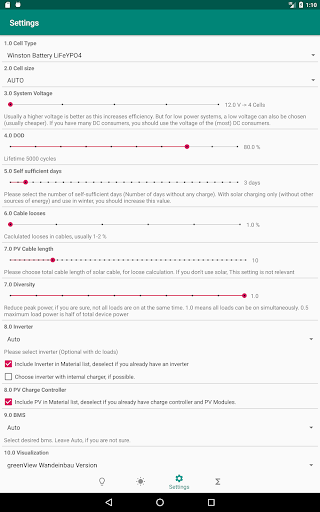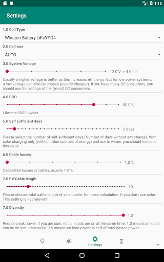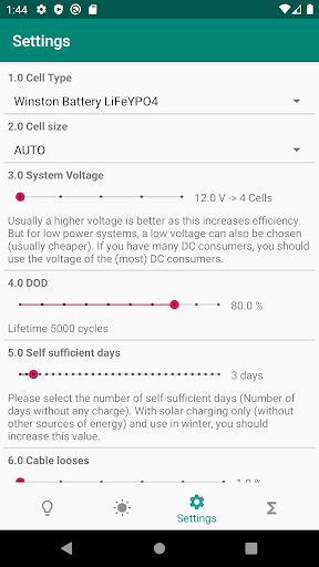 This tool helps you to calculate your off-grid power supply. Specially optimized for lithium technology (Winston cells). For comparison, you can also do the calculation with lead technology. This tool calculates the necessary PV power and can retrieve the location climate data from a server (PVGIS server). Battery to battery or mains charger can also be taken into account. As a result, you will receive a complete parts list with all materials (cables, cell connectors, BMS, switch-off relays, current sensors for a desired visualization / battery monitor).