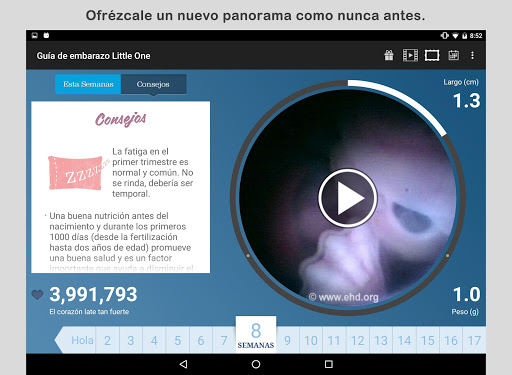 Esta aplicación gratuita presenta imágenes poco conocidas del embrión humano y el feto durante el primer trimestre, resúmenes semana a semana de momentos claves del desarrollo durante el embarazo, grabaciones de audio del latido prenatal y mucho más. La información inolvidable que proporcionará a cada una de las mujeres bajo su cuidado puede motivar el comportamiento saludable y promover el vínculo afectivo entre la madre y el feto.