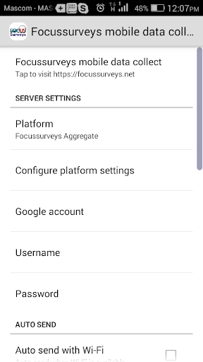 ~ You need to configure the server URL and username; drop an email to support@focussurveys.net and we will set you up.