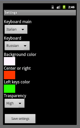 Long press on screen to save & remove settings, long press on "ABC" key to switch language.
