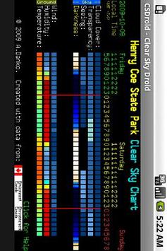 Clear Sky Droid interacts with cleardarksky.com to provide clear sky charts that describe astronomical viewing conditions.
