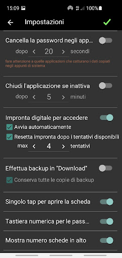 Per cautelarsi da malfunzionamenti, ed eventuali perdite di dati, si consiglia di attivare il backup automatico, magari selezionando una cartella creata nella memoria esterna (vedere la sezione "Impostazioni")