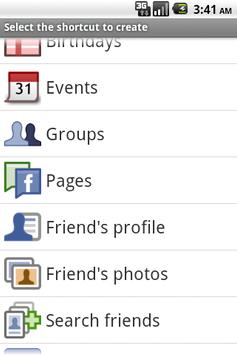 This app allows for the creation of quick shortcuts to specific pages of the official app on your homescreen: just add a new shortcut, choose what it should point to and you're done! You can choose among more than 15 different shortcuts, and more will follow (e.g., a picture of a specific friend).