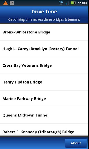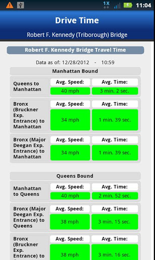 With just a tap, Drive Time(Formerly MTA EZTravel) tells you how traffic is moving at NYC's MTA Bridges and Tunnels, including the Verrazano-Narrows, Robert F. Kennedy (Triborough) and Bronx-Whitestone bridges, among others and the Queens Midtown and Hugh L. Carey (Brooklyn-Battery) Tunnels. You can also see how long it's taking to get from these crossings to other important local destinations.