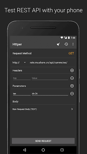 Httper is a REST API test tool running on your Android devices. It helps developers to test their REST API anywhere and anytime without desktops.