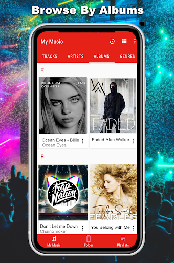 - Browse music by albums, artists, genre and Folders.