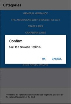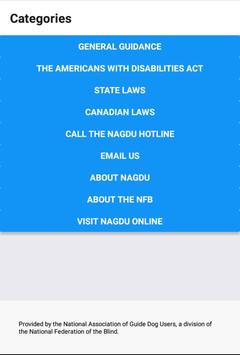 The NAGDU Guide & Service Animal Information & Advocacy app provides general information about the state and federal laws from the United States, as well as the laws from Canada, that protect the civil rights of disabled individuals who use service dogs. The app contains excerpts from the Americans with Disabilities Act (ADA), each of the state statutes, and the various laws from Canada that protect the rights of those who use service dogs, as well as general guidance concerning access to specific types of establishments, such as hotels, restaurants, health care facilities and more. In addition, this app provides the ability to directly connect with a live advocate who has been specially trained to help you resolve access issues as they occur.