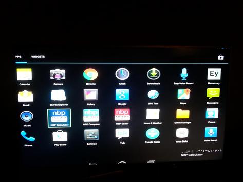 The NBP Calculator is a powerful calculator designed as an app for the B2G, a portable braille computer for the blind developed by National Braille Press. The NBP Calculator has a number of functions that can be selected for trigonometry,log, log10, complex and imaginary numbers, There is an input line to enter expressions that can be edited, with storage and recall capabilities.The standard layout includes a keypad with basic addition, subtraction, multiplication, division and scientific notation. The Alternate button changes the face of the layout for sin, cos, tan,rd2dg,abs, asin, acos, atan, dg2rd,arg, sinh, cosh,tanh sqrt,cnj. log10, log, exp, pi and i.